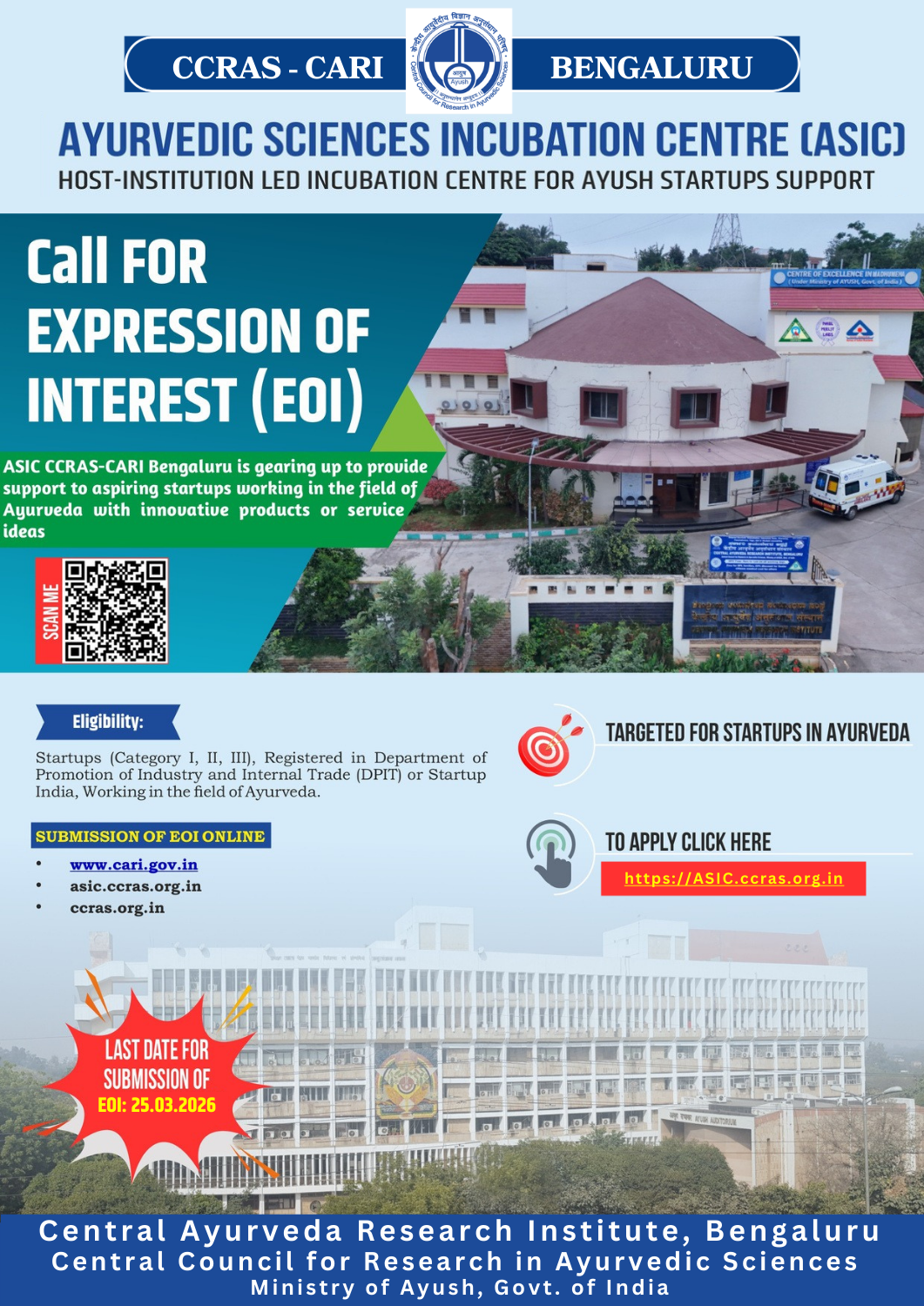 CCRAS-CARI, Bengaluru invites applications for the Ayurvedic Sciences Incubation Centre (ASIC) - supporting innovative startups in the field of Ayurveda.
